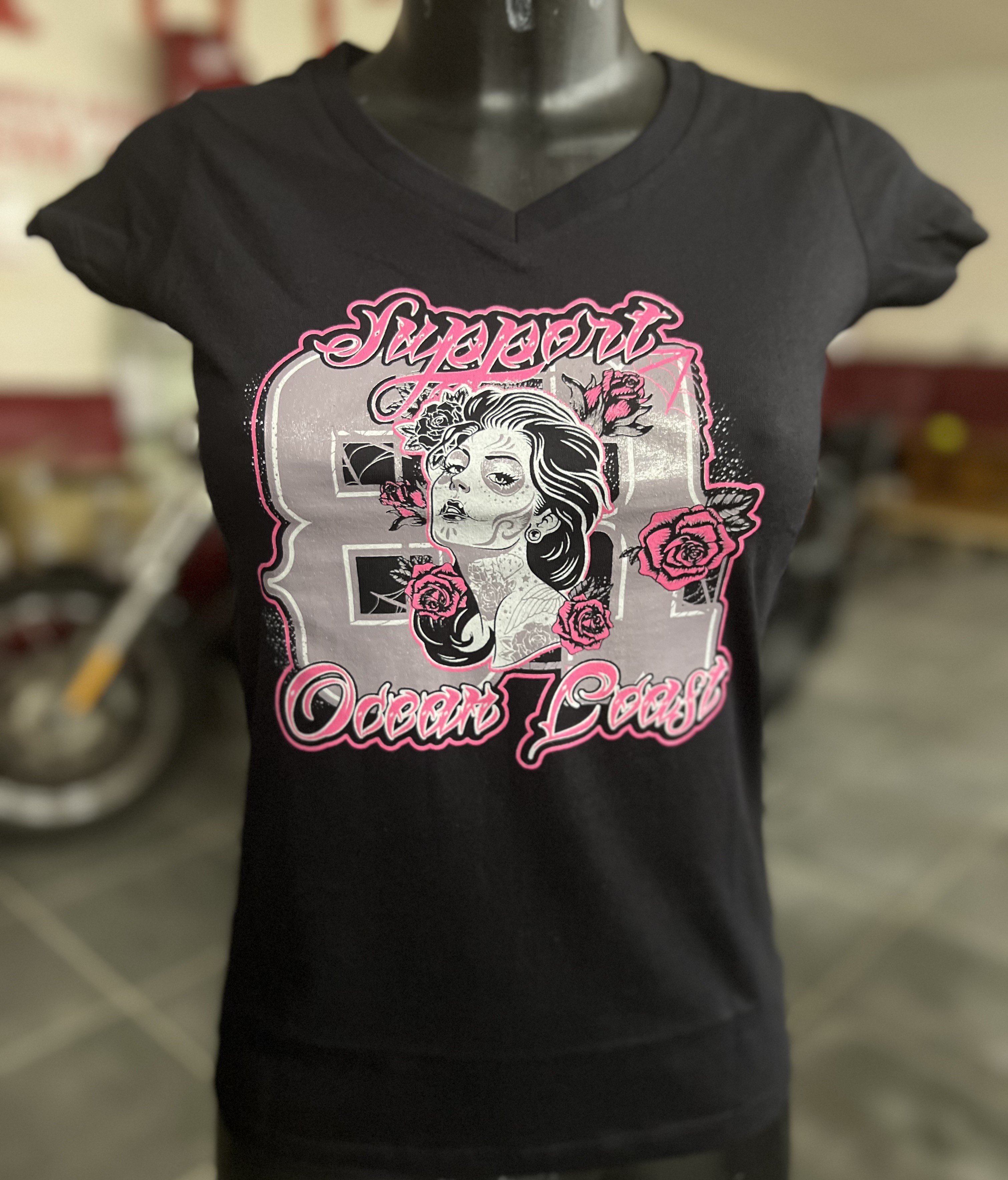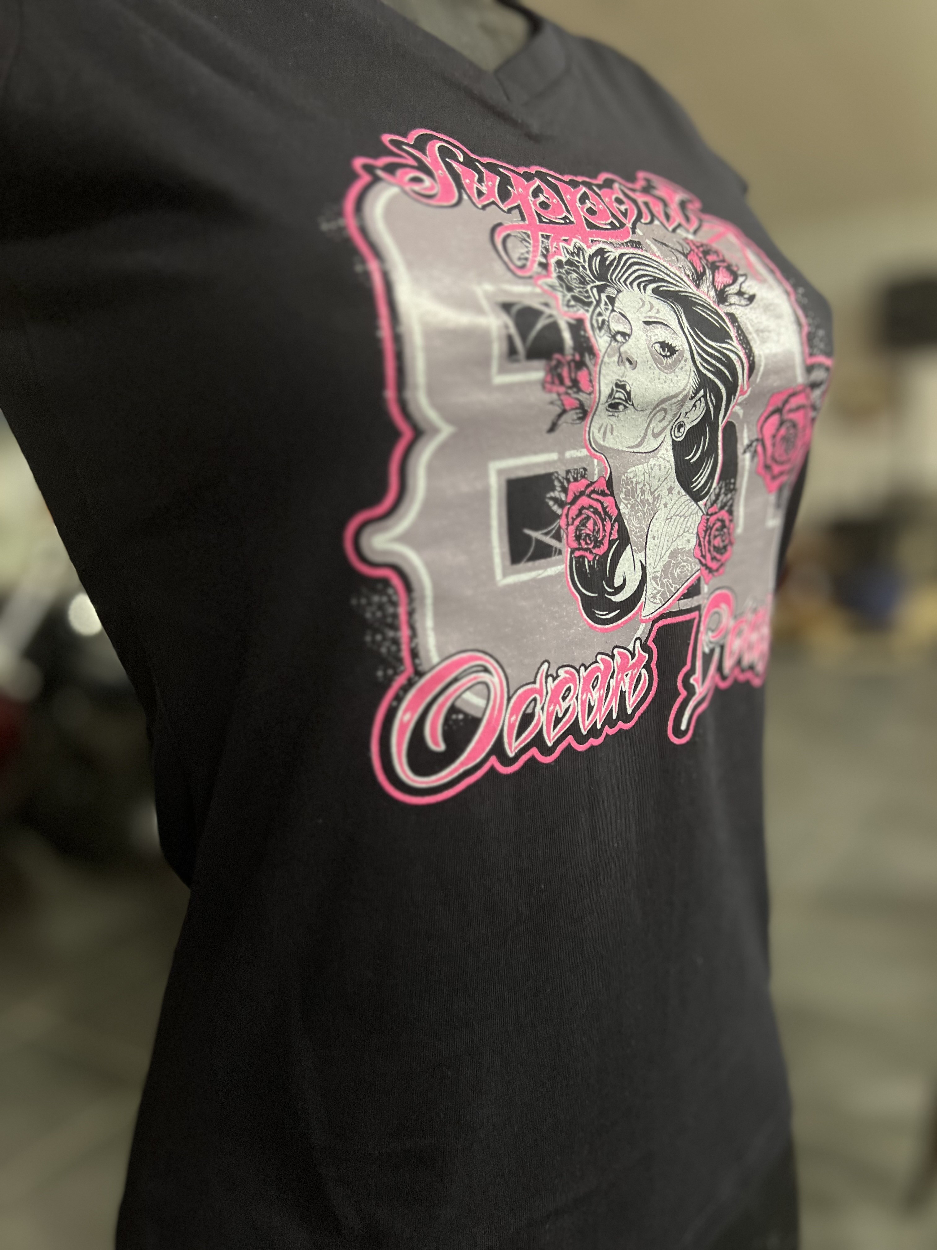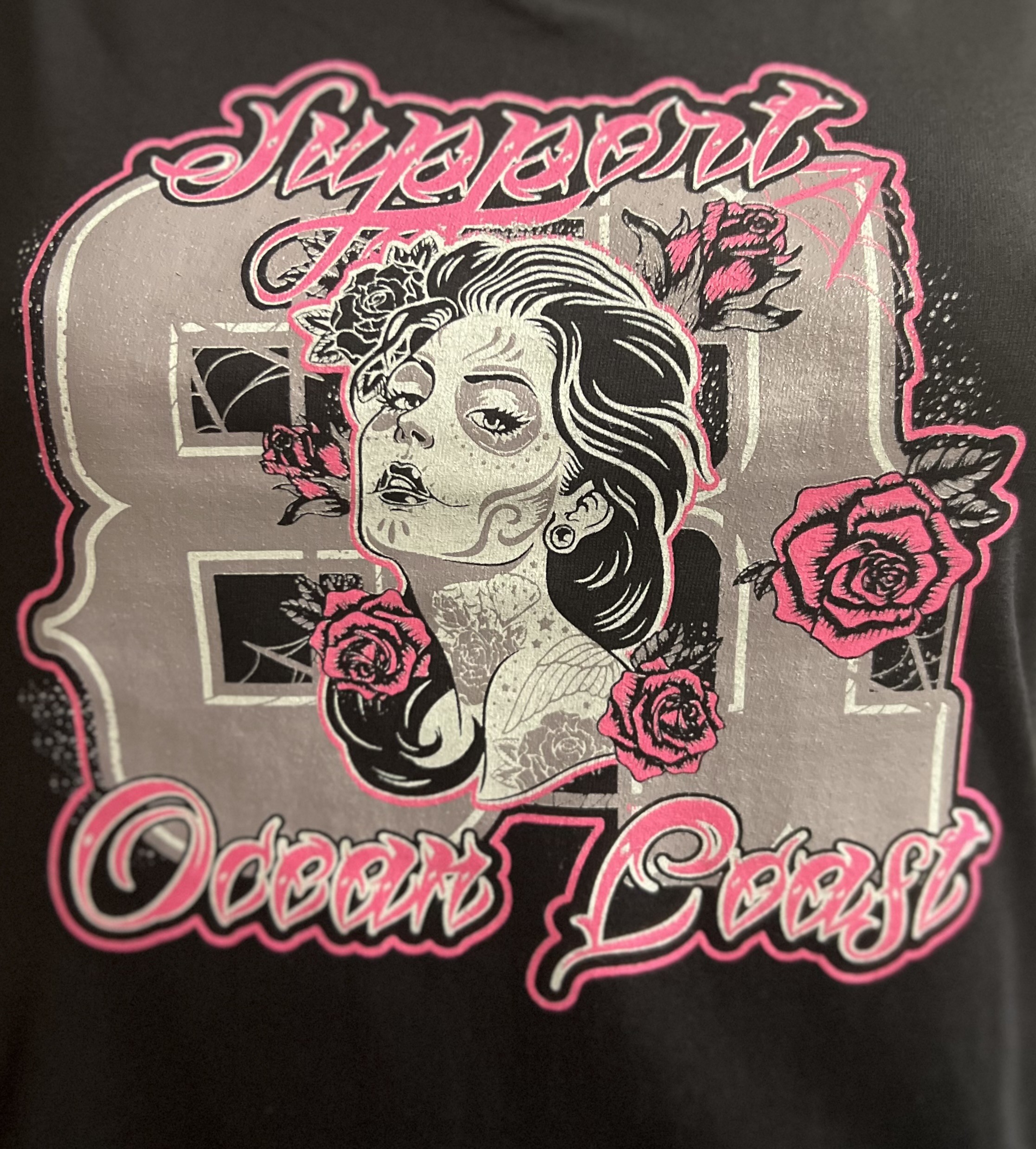 TEE SHIRT FEMME NOIR ROSE SUPPORT OCEAN COAST IMPRIME DEVANT