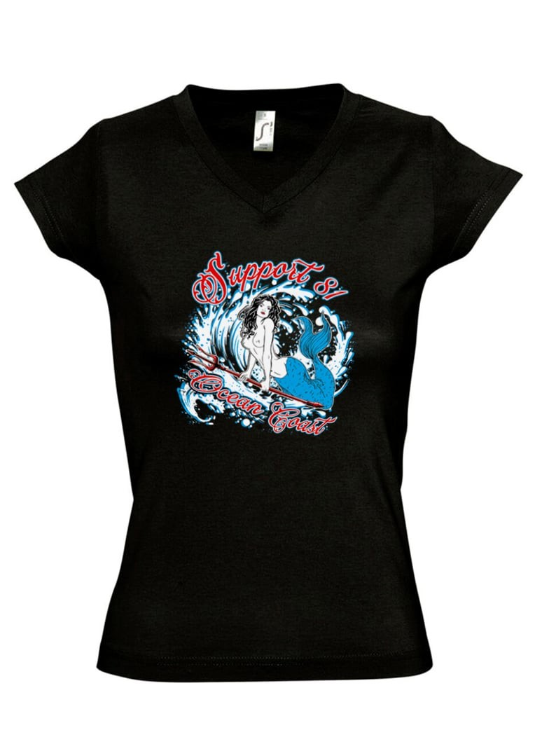 TEE SHIRT FEMME NOIR SIRENE SUPPORT OCEAN COAST IMPRIME DEVANT COL V