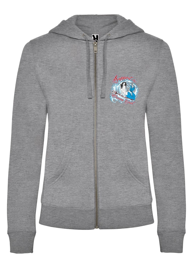 Sweat capuche coupe femme, zippé, 2 poches, floqué poitrine et dos